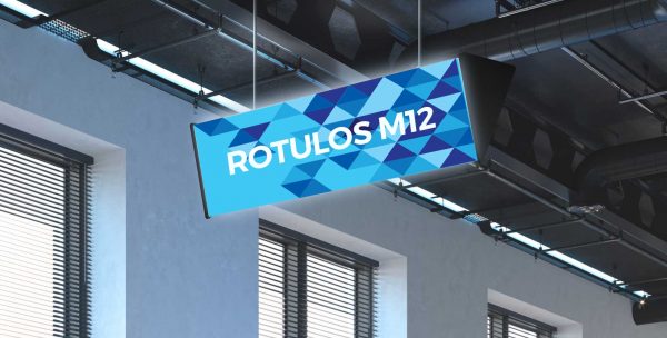 Entre sus ventajas está la visibilidad a distancia, ya que está suspendido del techo, teniendo la posibilidad de verlo por sus dos caras. Disponible en varios tamaños según las necesidades de tu negocio.